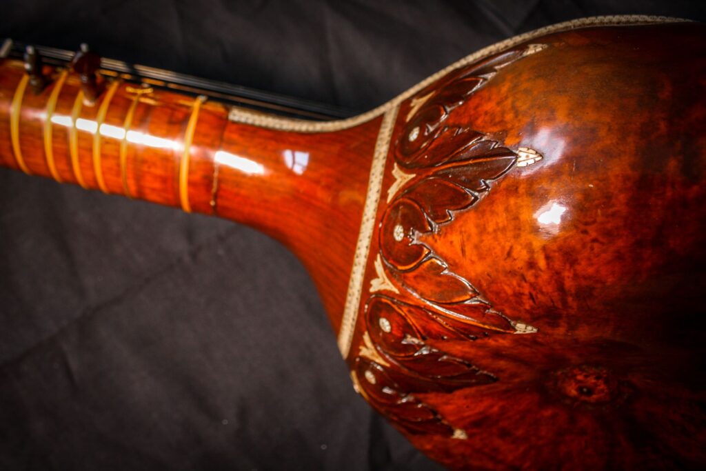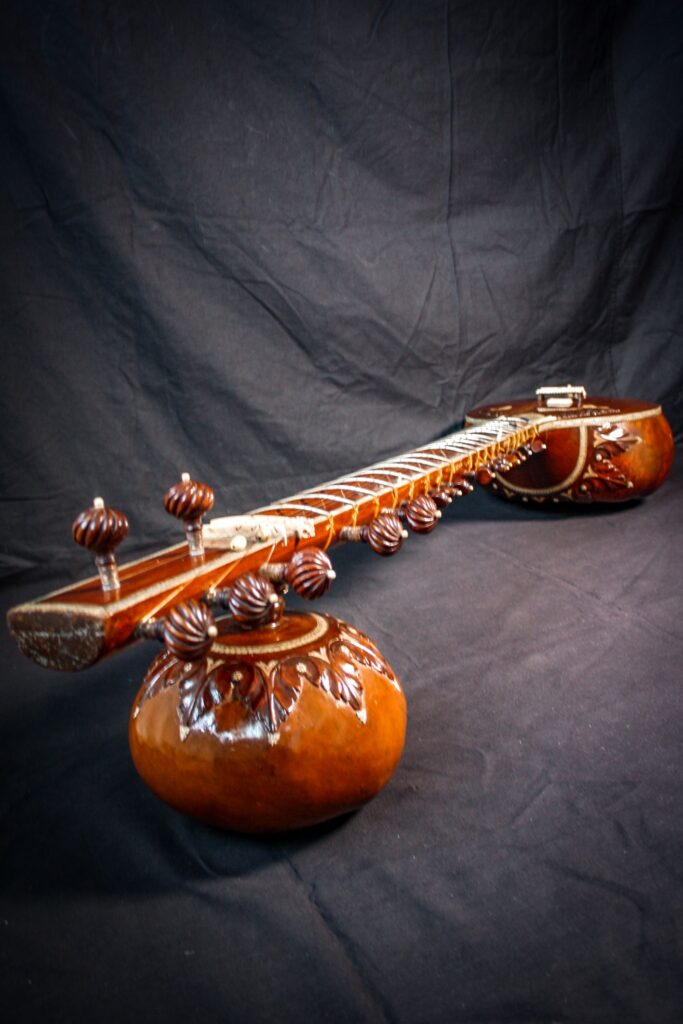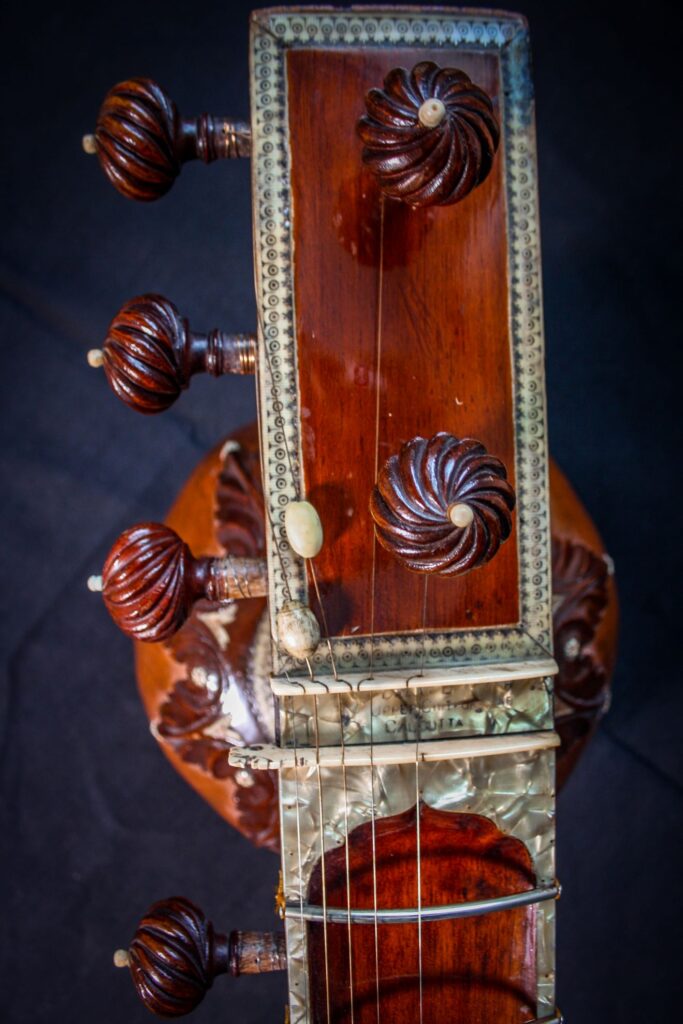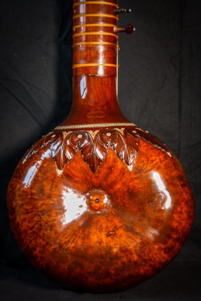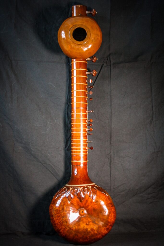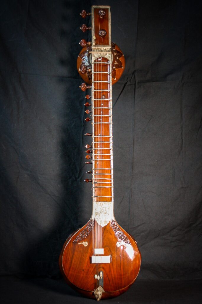 A very unique sitar that allows a glimpse into the old-world sound-aesthetics. This flatback type of sitar is more akin towards Surbahar and was more popular in the distant past where it was known as Kachhapi Vina: „an ancient Indian stringed instrument named for its tortoise-like shape, featuring a large, flat resonator (like a tortoise shell) and a long neck, known from Vedic texts and related to more modern instruments like the Kachhua Sitar or Surbahar, representing an early form of the lute family in India.“ This sitar has a very thin soundboard and is therefore very loud. A clear indicator of its pre-microphone-era origin. The carving is very minimal but delicate and beautiful. In terms of sound it is very unique: loud and resonant with an instant attack that fills up the room with a beautiful low end and silky highs. Toon-wood, original horn bridges, original upper tumba, 11 taraf strings, half decoration, kharaj-string hook on last fret.