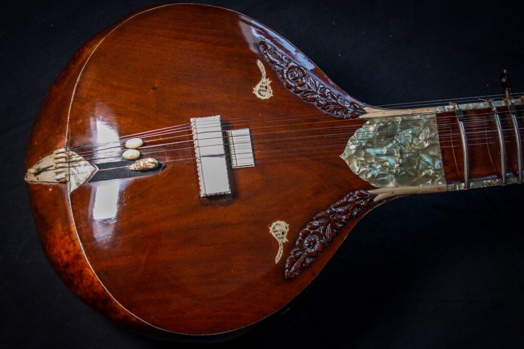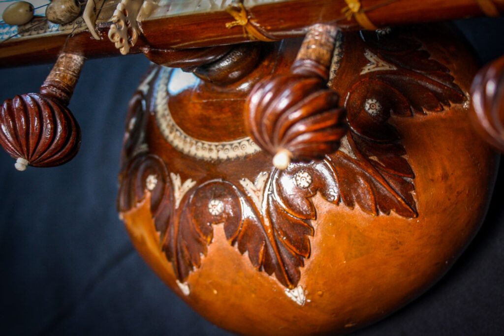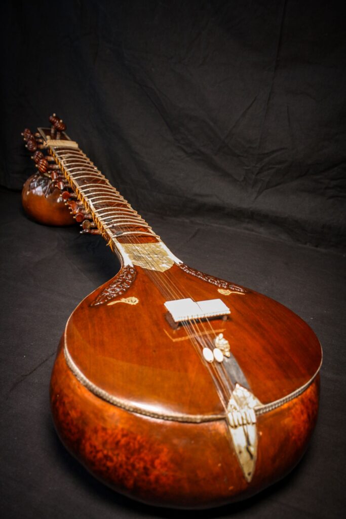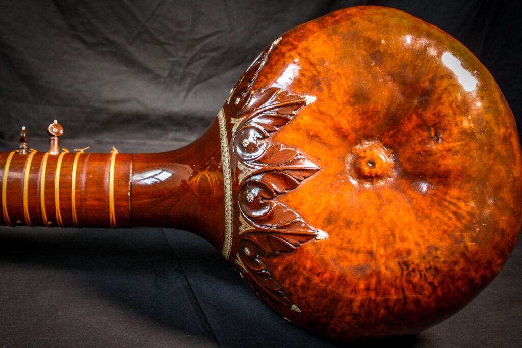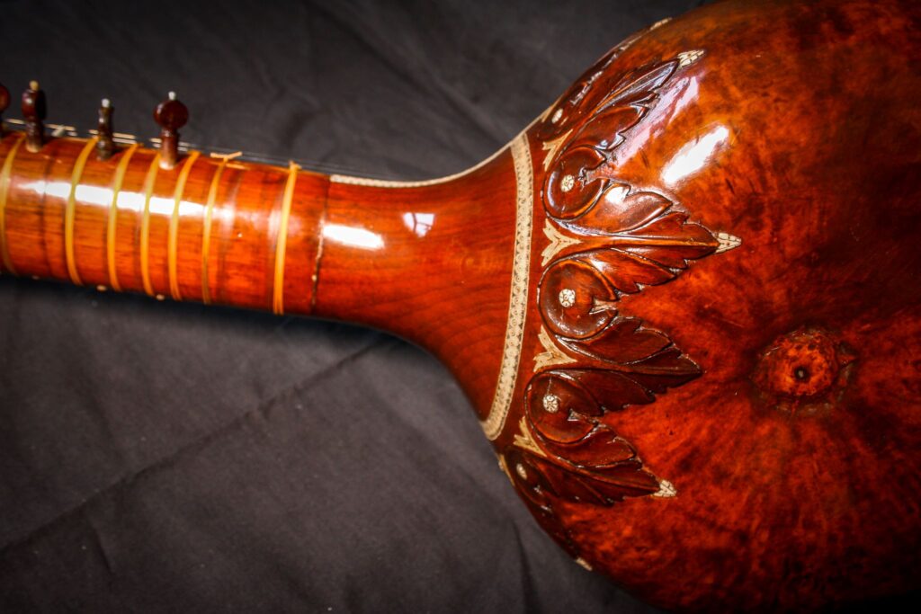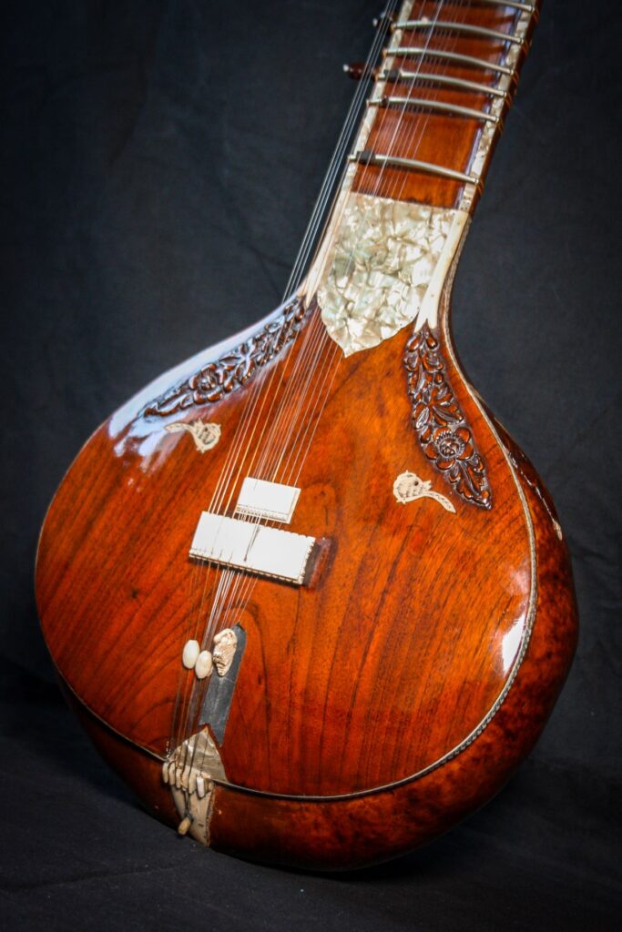 A very unique sitar that allows a glimpse into the old-world sound-aesthetics. This flatback type of sitar is more akin towards Surbahar and was more popular in the distant past where it was known as Kachhapi Vina: „an ancient Indian stringed instrument named for its tortoise-like shape, featuring a large, flat resonator (like a tortoise shell) and a long neck, known from Vedic texts and related to more modern instruments like the Kachhua Sitar or Surbahar, representing an early form of the lute family in India.“ This sitar has a very thin soundboard and is therefore very loud. A clear indicator of its pre-microphone-era origin. The carving is very minimal but delicate and beautiful. In terms of sound it is very unique: loud and resonant with an instant attack that fills up the room with a beautiful low end and silky highs. Toon-wood, original horn bridges, original upper tumba, 11 taraf strings, half decoration, kharaj-string hook on last fret.