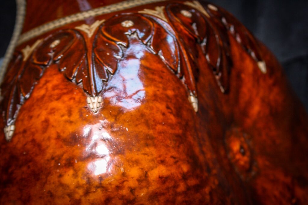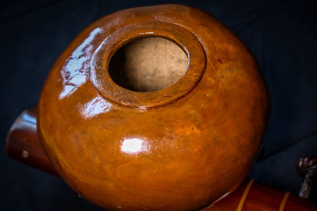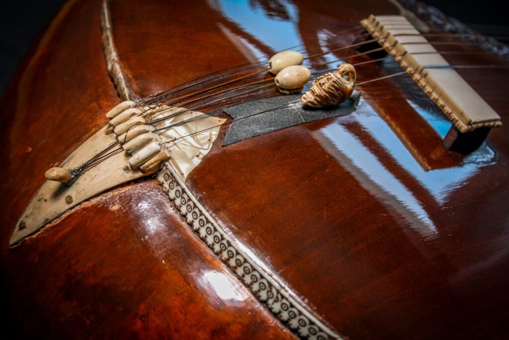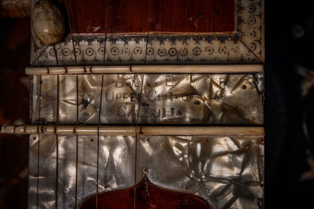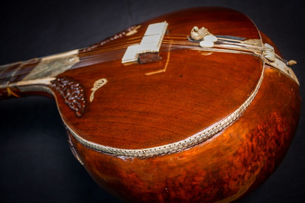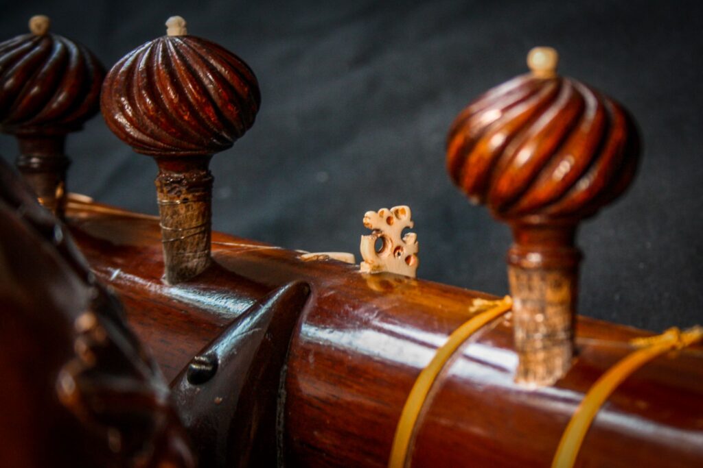 A very unique sitar that allows a glimpse into the old-world sound-aesthetics. This flatback type of sitar is more akin towards Surbahar and was more popular in the distant past where it was known as Kachhapi Vina: „an ancient Indian stringed instrument named for its tortoise-like shape, featuring a large, flat resonator (like a tortoise shell) and a long neck, known from Vedic texts and related to more modern instruments like the Kachhua Sitar or Surbahar, representing an early form of the lute family in India.“ This sitar has a very thin soundboard and is therefore very loud. A clear indicator of its pre-microphone-era origin. The carving is very minimal but delicate and beautiful. In terms of sound it is very unique: loud and resonant with an instant attack that fills up the room with a beautiful low end and silky highs. Toon-wood, original horn bridges, original upper tumba, 11 taraf strings, half decoration, kharaj-string hook on last fret.