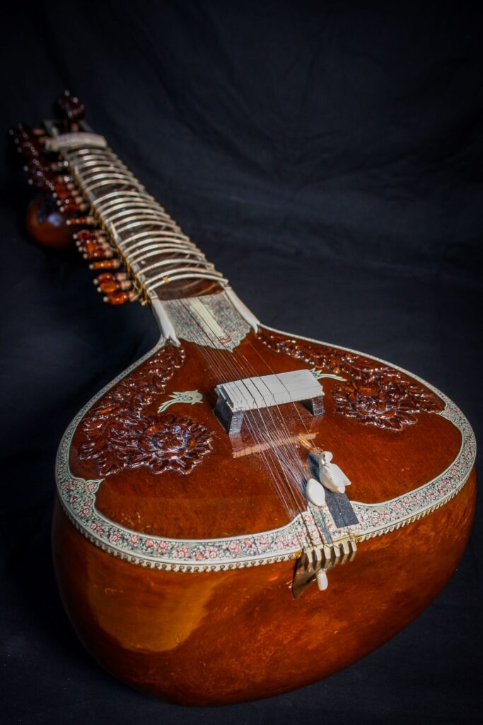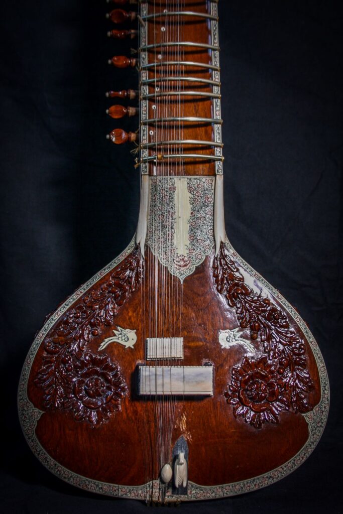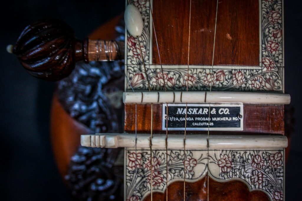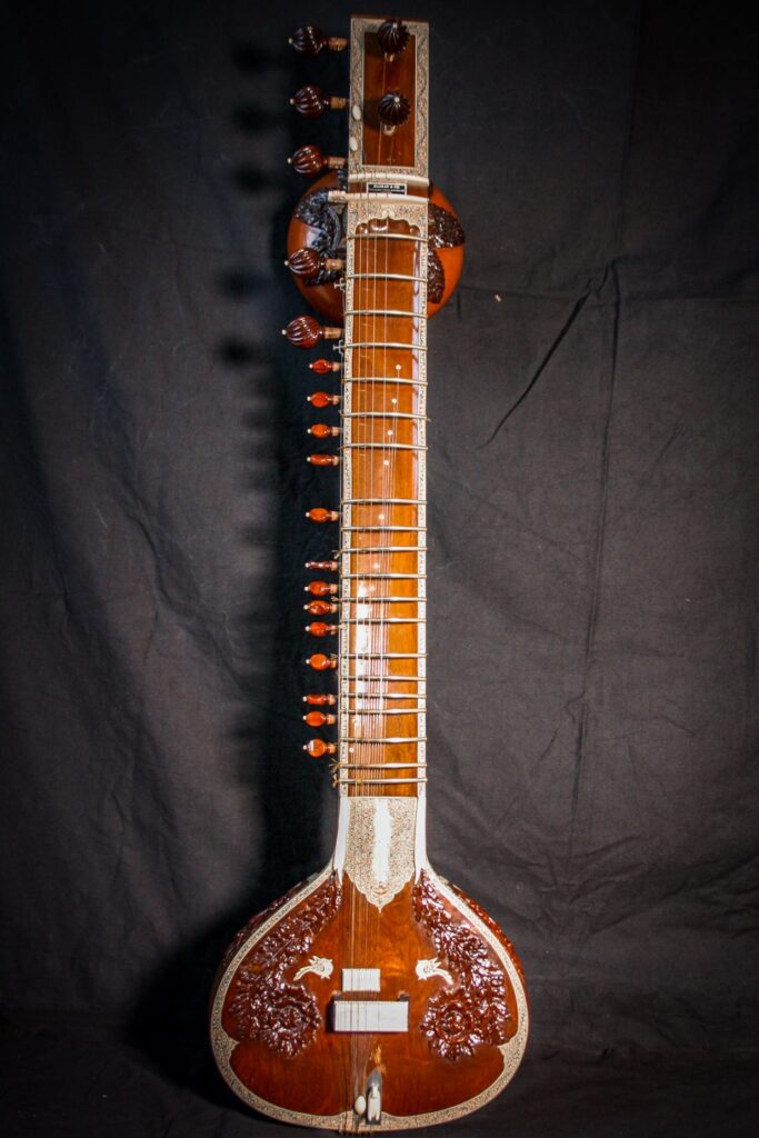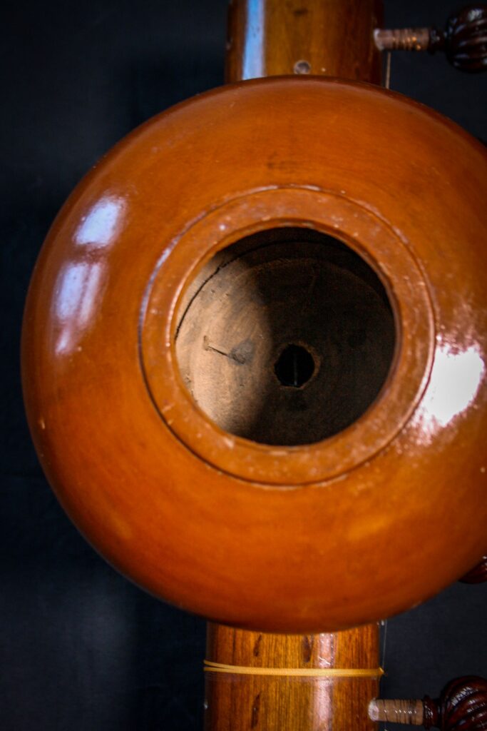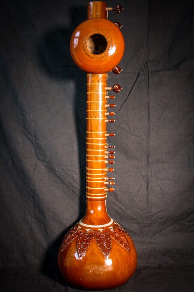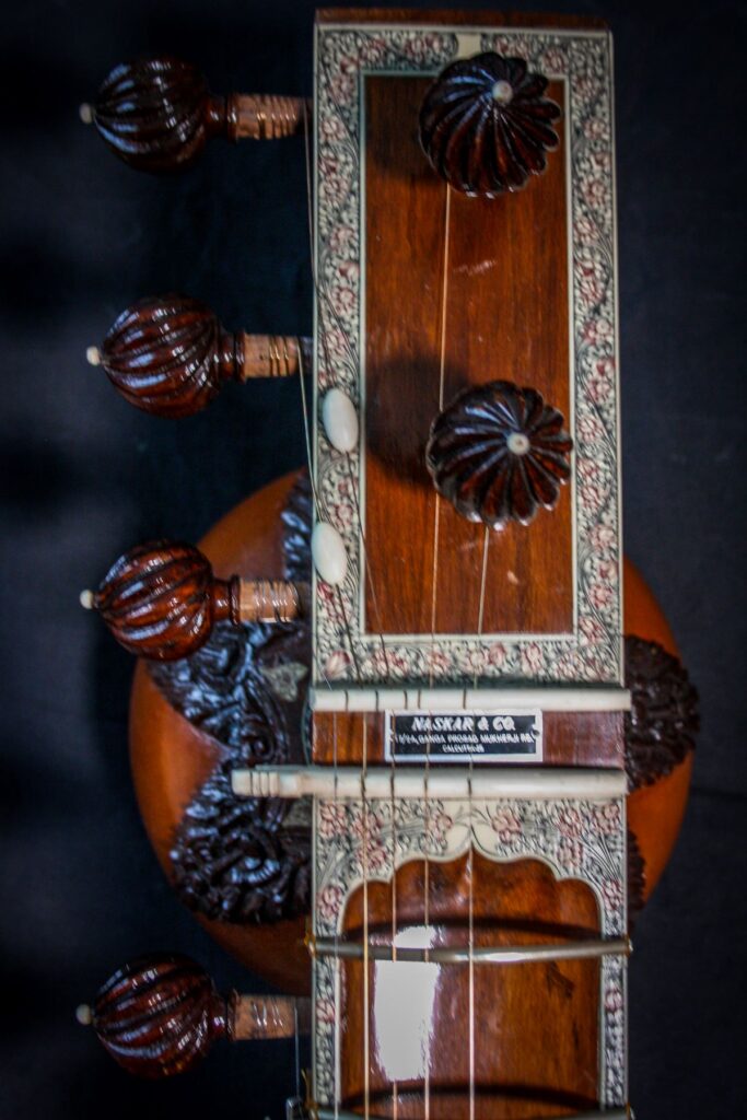 The instruments from the workshops of Naskar, Radha Krishna Sharma, Makan Lal and a few other Kolkata makers have always been overshadowed by the more popular names of Hiren Roy, Kanai Lal and Hemen. Nevertheless in most instances they could deliver the same or similar quality of instruments. This Naskar & Co sitar comes from the 1980ies and has been completely repolished by its previous owner. Therefore it appears somewhat younger. It is a very solid and slightly heavy (in terms of weight) sitar. Besides a few scratches on the tabli it is in excellent condition. Toon-wood, original horn bridges, original upper tumba, 13 taraf strings, full decoration, kharaj-string hook on last fret.