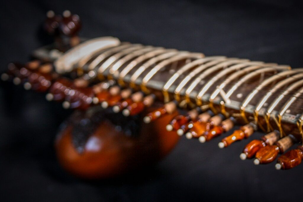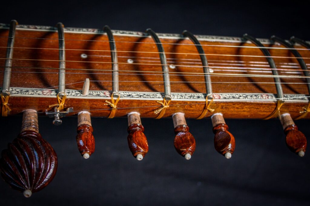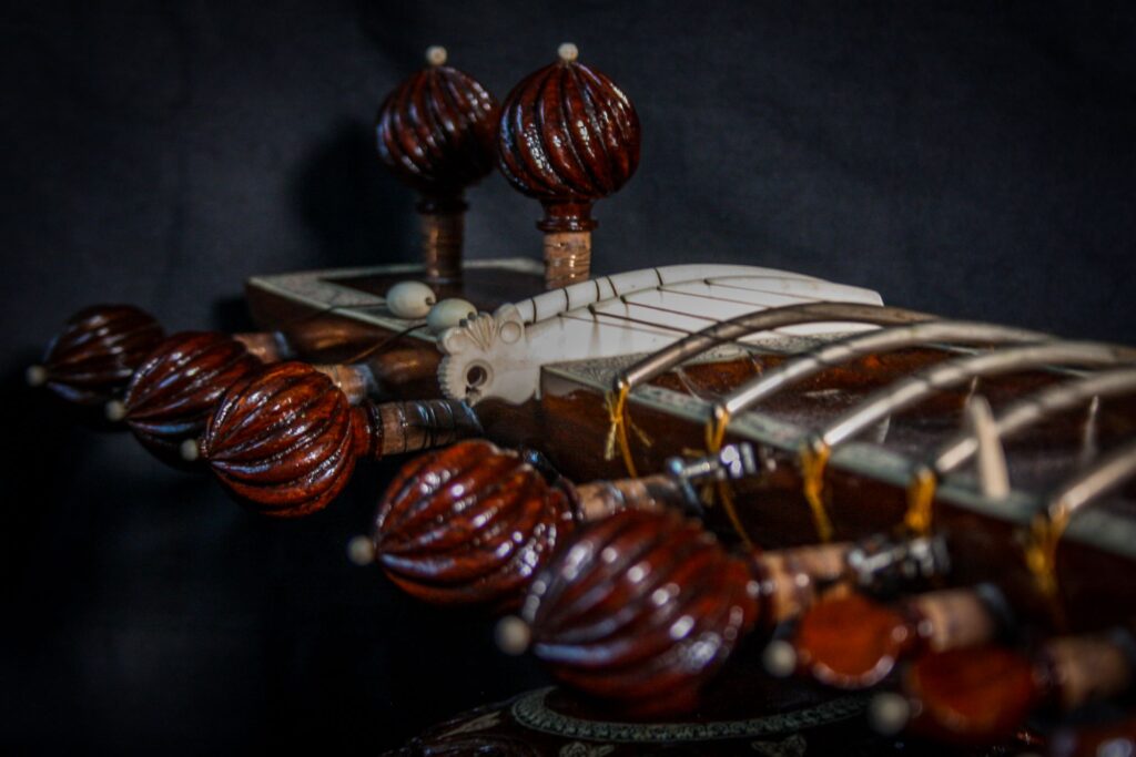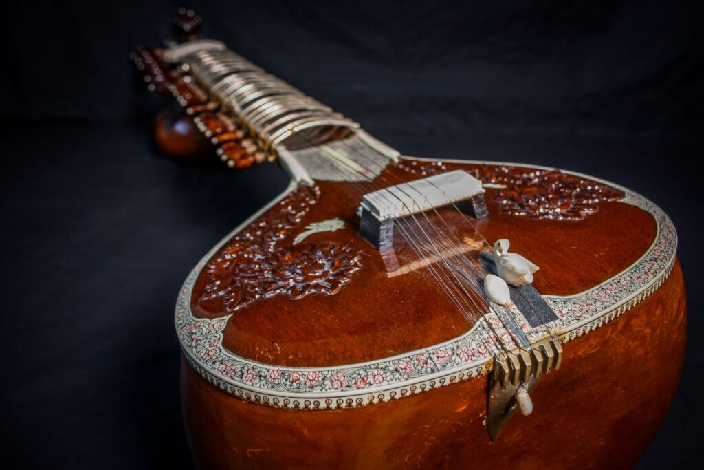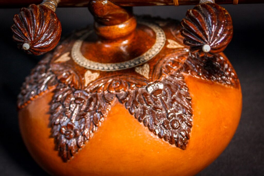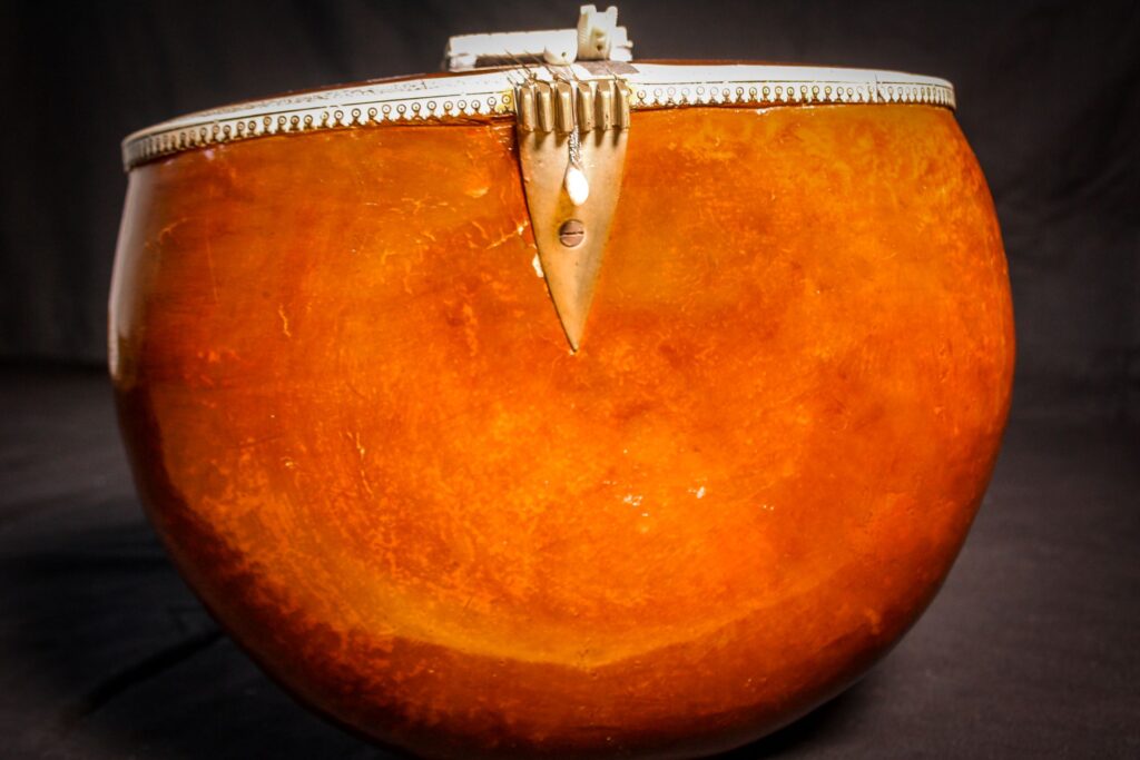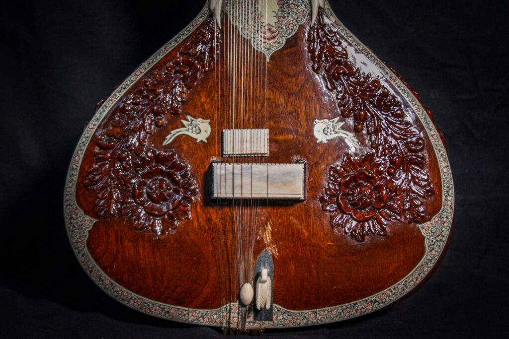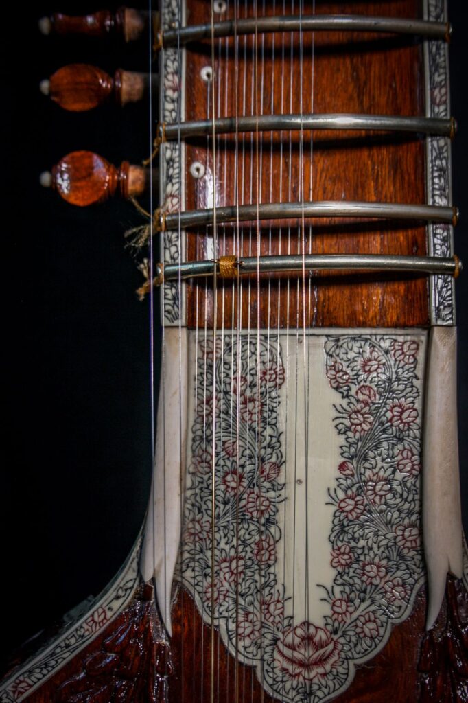 The instruments from the workshops of Naskar, Radha Krishna Sharma, Makan Lal and a few other Kolkata makers have always been overshadowed by the more popular names of Hiren Roy, Kanai Lal and Hemen. Nevertheless in most instances they could deliver the same or similar quality of instruments. This Naskar & Co sitar comes from the 1980ies and has been completely repolished by its previous owner. Therefore it appears somewhat younger. It is a very solid and slightly heavy (in terms of weight) sitar. Besides a few scratches on the tabli it is in excellent condition. Toon-wood, original horn bridges, original upper tumba, 13 taraf strings, full decoration, kharaj-string hook on last fret.