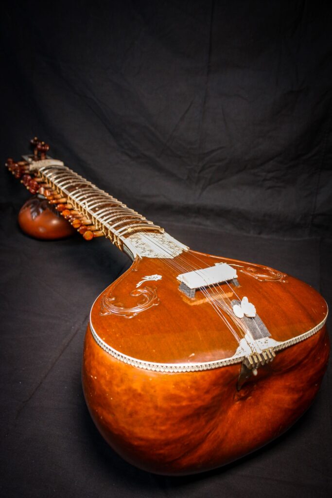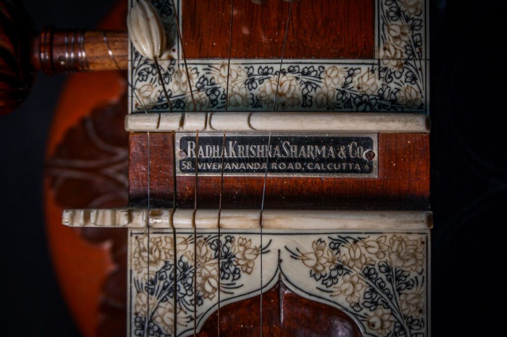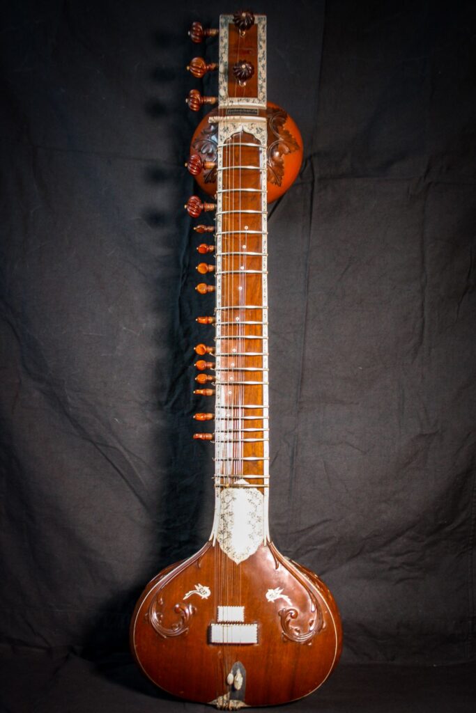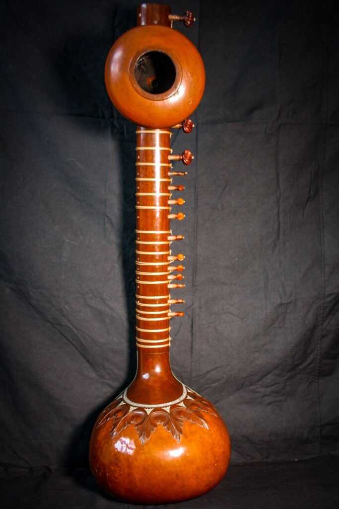Besides the well known instrument makers Hiren Roy and Hemen, the Radha Krishna Sharma workshop was one of the finest sitar makers during the golden days (roughly the 1940ies-1980ies) of sitar making in Kolkata. I found that old RKS sitars are among the most satisfying instruments for players that are looking for a slightly more open and resonant sound with lots of dynamic possibilities and instant attack. This one is a great example of just these qualities. It is very well preserved and has been completly restored to its best capabilities on my workbench. Toon-wood, original horn bridges, original upper tumba, 11 taraf strings, half decoration, kharaj-string hook on last fret.