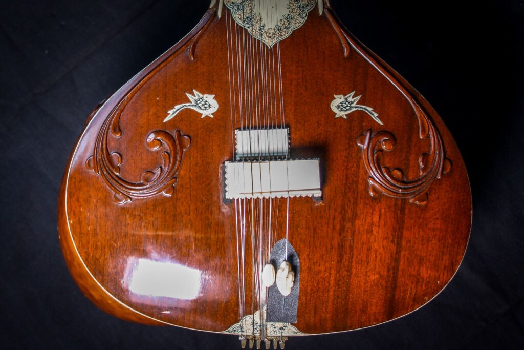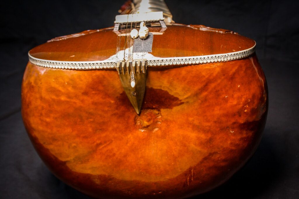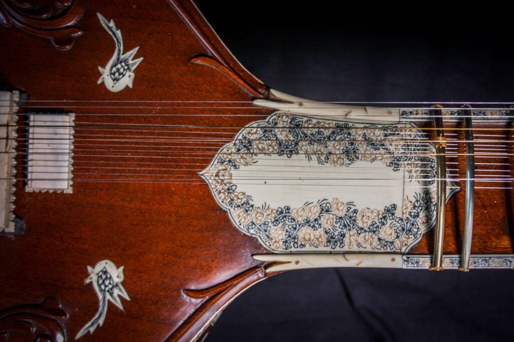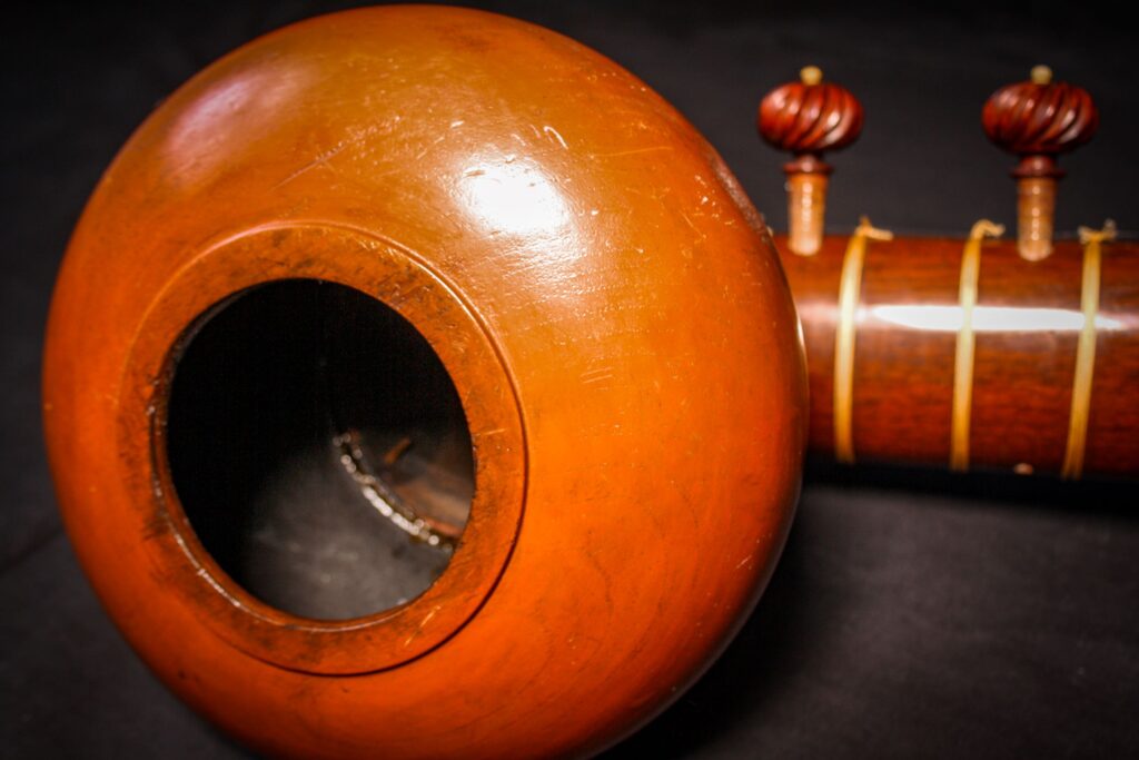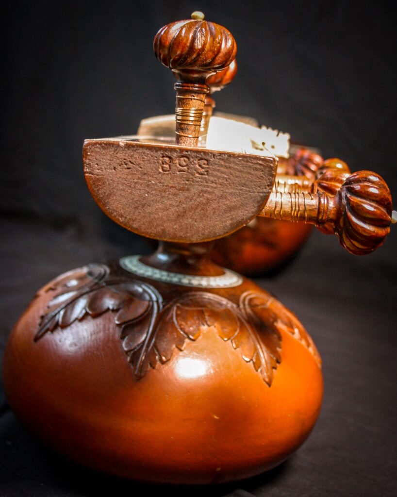 Besides the well known instrument makers Hiren Roy and Hemen, the Radha Krishna Sharma workshop was one of the finest sitar makers during the golden days (roughly the 1940ies-1980ies) of sitar making in Kolkata. I found that old RKS sitars are among the most satisfying instruments for players that are looking for a slightly more open and resonant sound with lots of dynamic possibilities and instant attack. This one is a great example of just these qualities. It is very well preserved and has been completly restored to its best capabilities on my workbench. Toon-wood, original horn bridges, original upper tumba, 11 taraf strings, half decoration, kharaj-string hook on last fret.